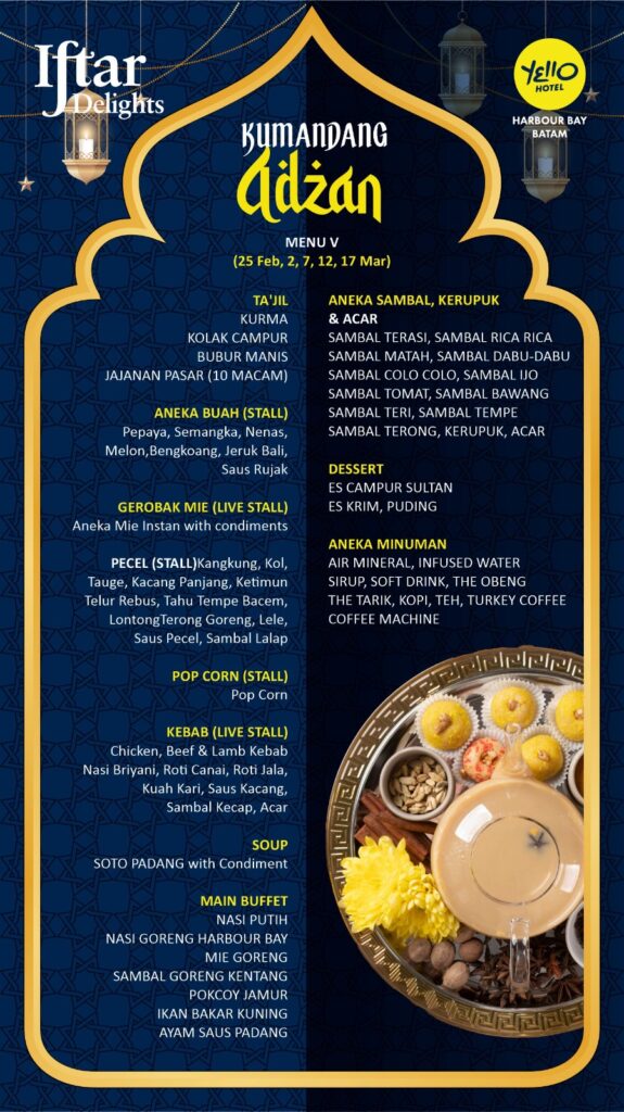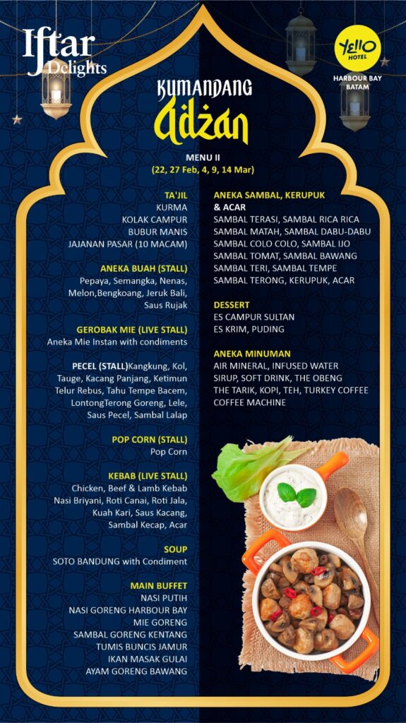 Tahun ini, jika Anda mencari tempat berbuka yang memiliki karakter unik, modern, dan terletak di kawasan paling strategis di Batam, maka Yello Hotel Harbour Bay adalah jawabannya. Mengusung tema “Iftar Kumandang Adzan”, Yello Hotel menawarkan pengalaman kuliner yang tidak hanya memanjakan lidah, tetapi juga menyuguhkan atmosfer yang segar dan penuh energi.